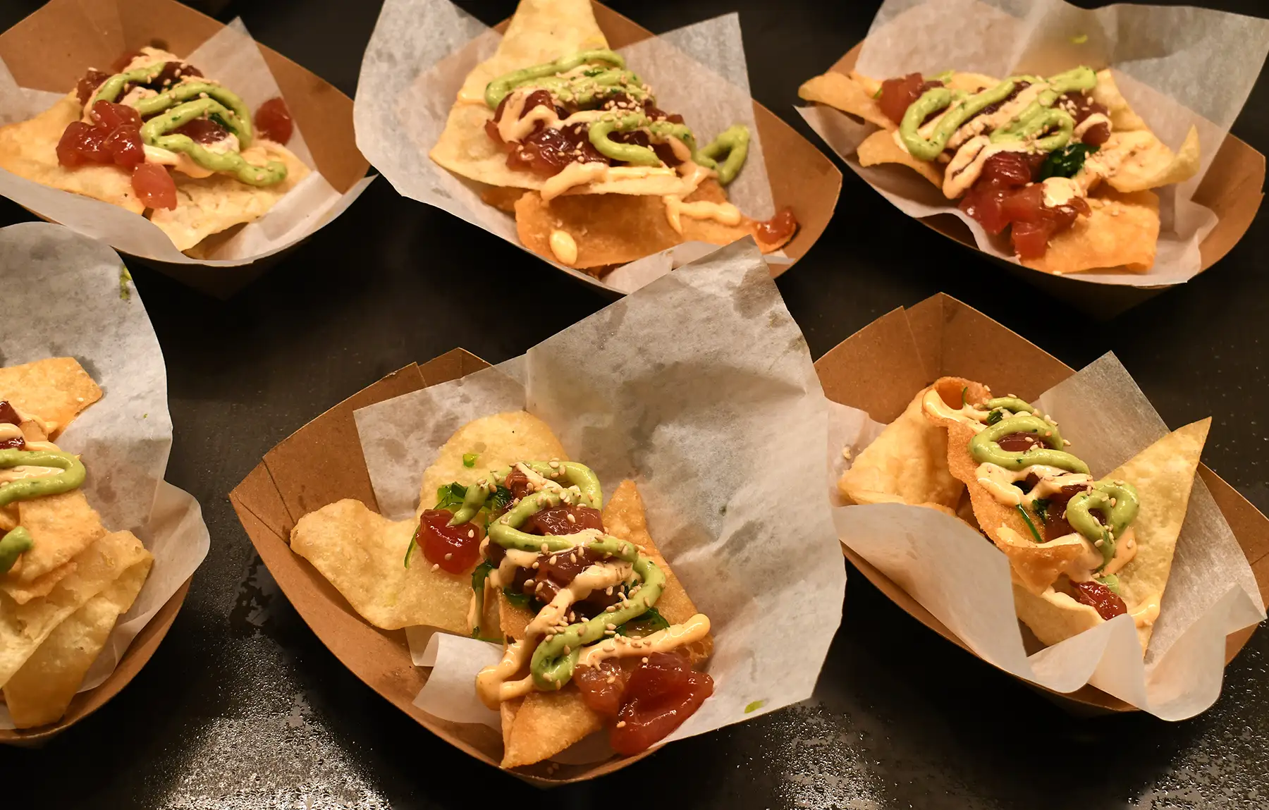 Ahi marinated in soy sauce, ginger, crushed red pepper, and sesame oil, topped with Sriracha aioli & avocado lime drizzle, served over seaweed salad with cucumber wontons.
